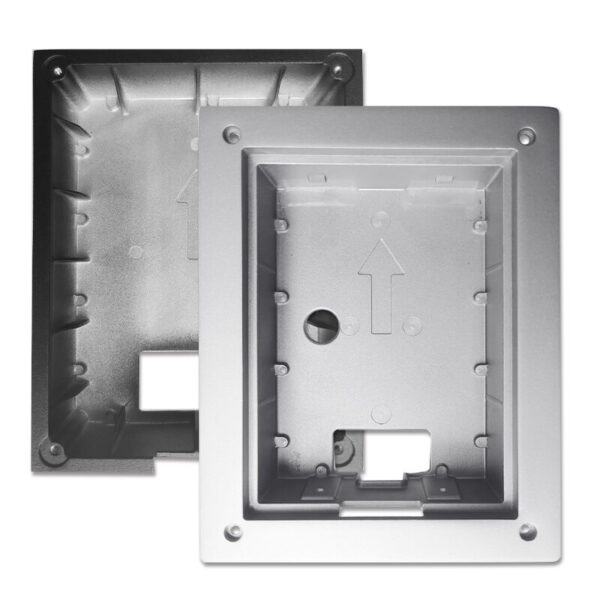 Flush Mounted Box for VTO2202F-P • Material: ADC12 • Dimensions(Front) : 128.9mm×162.9mm×34.5mm (5.08″”×6.42″”×1.36″”) • Dimensions(rear) : 123.0mm×157.0mm×35.0mm (4.84″”×6.18″”×1.38″”)