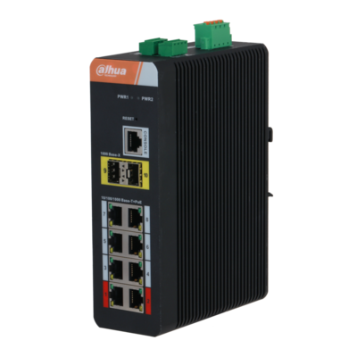 10-Port Managed Industrial Gigabit Switch with 8-Port PoE (Managed) • All-gigabit port design. • Supports IEEE802.3af IEEE802.3at Hi-PoE and IEEE802.3bt (red port) standards. • 250 m long-distance PoE transmission (10 Mbps). • PoE Watchdog. • Supports STP RSTP and ERPS. • IEEE802.1Q-based VLAN configuration. • Manual link aggregation and static LACP. • Desktop mount and DIN-rail mount.