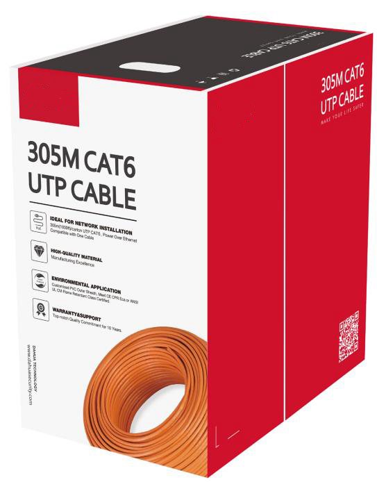 UTP CAT6 Cable • 305.0 m (1000 ft)/carton UTP CAT6 power over Ethernet compatible with one cableConductor: 0.57mm 23AWG CCA Sheath: PVC meet CE CPR Eca flame retardant class certified